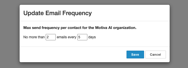 Email frequency can be changed from within your Motiva instance by clicking on the Frequency tab, then selecting Configuration. You should see this interface at the top: