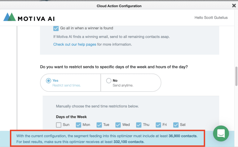 To gather enough data to determine statistical significance, Motiva requires a minimum number of contacts and our model runs for several days so you don’t get fooled by random spikes or dips in engagement. You’ll see a blue notification bar appear at the bottom of the Message Test configuration window that alerts you to the contact requirements. See below.