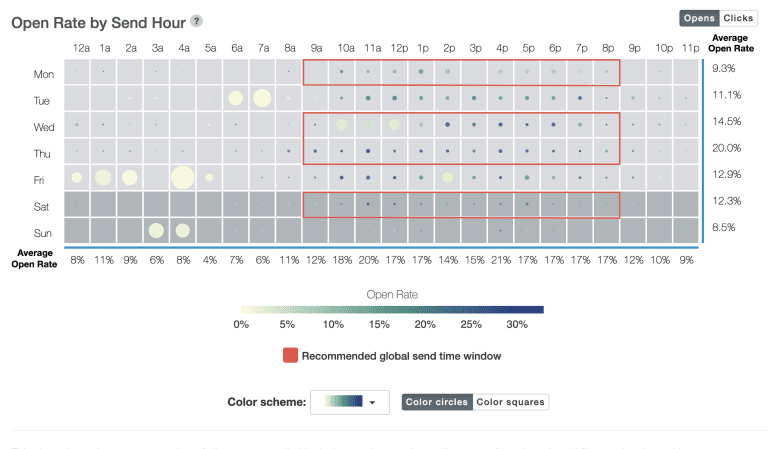 For instance, looking at the global Send Time chart above, the send windows with the highest overall engagement are 9am and 8pm on Mondays, Wednesdays, Thursdays, and Saturdays (outlined in red). Use this insight to improve your open rates on simple batch and blast emails or to obtain the quickest feedback from your contacts for a Message Test.