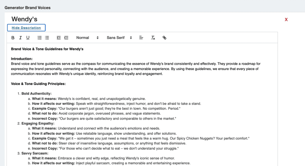 This will automatically generate guidelines for you. Click “Create Brand Voice” to save it. You’ll see that each custom brand voice in the list has a “Show Description” option under the name. Click this option to see your automatically generated brand guidelines. Read through it and see what you think. Feel free to revise and edit the guidelines generated to better align messaging with your brand.