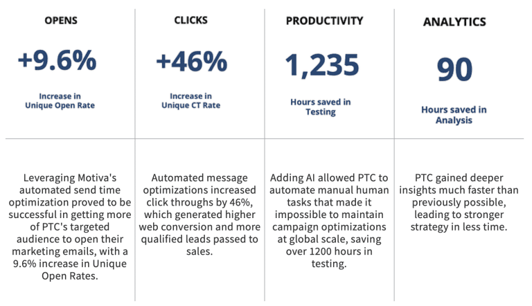PTC leveraged Motiva’s automated optimizations and analytics to improve engagement and lead velocity. Anna and Mike were able to initiate a rapid transformation because Motiva integrates into existing workflows, making it easier to optimize content and send time.