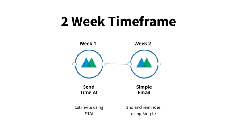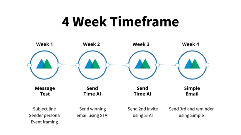 Here’s an example of a four-week timeframe with a total of three invites and one reminder. Start out with MT and transition to Send Time AI for the first email invite. Use Send Time AI for the second email invite. Then take a look at Motiva’s Send Time Report to find the best send time for the third invite using a simple email step. Close out with a reminder just before the event.